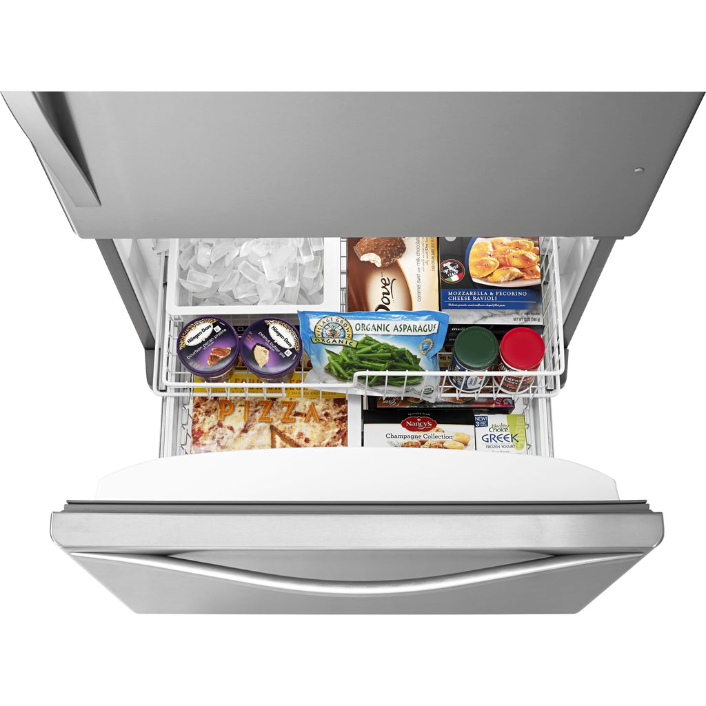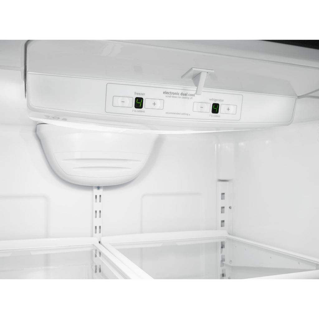 Vous pouvez facilement ranger tous vos aliments frais ou congelés dans ce réfrigérateur à congélateur inférieur d'une capacité de 22... Vous pouvez facilement ranger tous vos aliments frais ou congelés dans ce réfrigérateur à congélateur inférieur d'une capacité de 22 pi cu. Grâce au tiroir du congélateur, les aliments surgelés sont à portée de la main, faciles à organiser et à repérer. Conservez tous vos aliments à la température idéale sans gaspiller de l'énergie grâce au système de gestion de la température Accu-Chill™. Des capteurs intégrés mesurent la température intérieure et n'activent le compresseur qu'au besoin seulement. Les ampoules éconergétiques à DEL projettent un éclairage plus naturel sur les aliments, tandis que le conservateur de fruits et légumes FreshFlow™ prolonge la durée de fraîcheur des aliments jusqu'à 4 jours* et en conserve la saveur. Voir plus