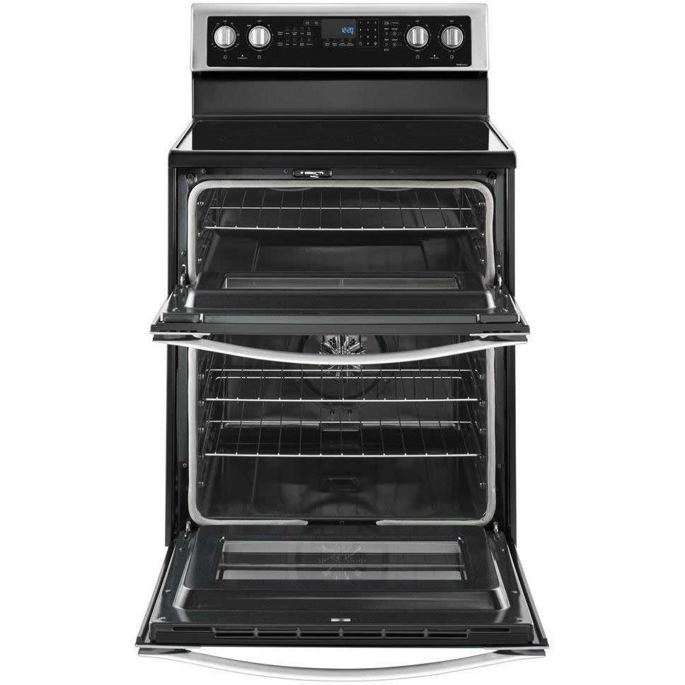 Get dinner on the table quickly with this electric double oven range. True convection cooking lets you cook food faster.... Get dinner on the table quickly with this electric double oven range. True convection cooking lets you cook food faster. Convection Conversion will do the math for you to adjust cooking times and temperatures. Skip preheating this kitchen range for frozen favorites like pizza, lasagna, chicken nuggets, fries or pies, thanks to Frozen Bake™ technology. The FlexHeat™ triple radiant element is like having three elements in one to fit small pots and pans and make room for larger cookware on the range stove. And if you make a mess, AquaLift® self-cleaning technology provides this kitchen range with odor-free cleaning without harsh chemicals in only 50 minutes. View more